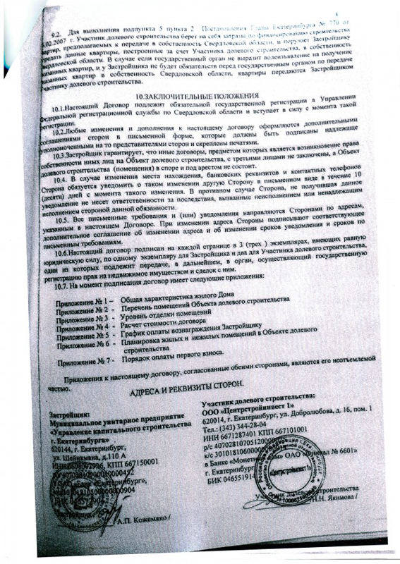 Есть еще один нюанс. Договор отсылает нас к документу под названием «Постановление Главы Екатеринбурга № 770 от 26 февраля 2007 года «О предоставлении ООО «Фирма Поинт и К» и МУП «УКС Екатеринбурга» земельного участка по улице Шейнкмана для строительства жилых домов со встроенными нежилыми помещениями в цокольном, на 1-2-3-х этажах и подземных паркингов». Дело в том, что документа нет в свободном доступе – на сайте мэрии Екатеринбурга постановление за указанным номером отсутствует. Судя по всему, именно этот документ может пролить свет на то, в каких именно ситуациях и как Свердловская область может истребовать квартиры в свою собственность.