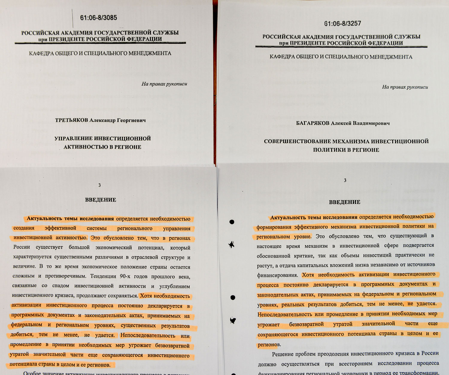 Согласно правилам «Диссернета», подтвержденным считается плагиат, представляющий из себя крупномасштабное цитирование более ранних научных работ, не оформленное соответствующим образом. Для Алексея Багарякова такой работой, с которой проходило «списывание», стала защищенная в том же году диссертация Александра Георгиевича Третьякова «Управление инвестиционной активностью в регионе». Научным руководителем этой работы был тот же профессор Сергей Раевский, она защищалась в той же Академии государственной службы, но немного раньше – в марте 2006 года.