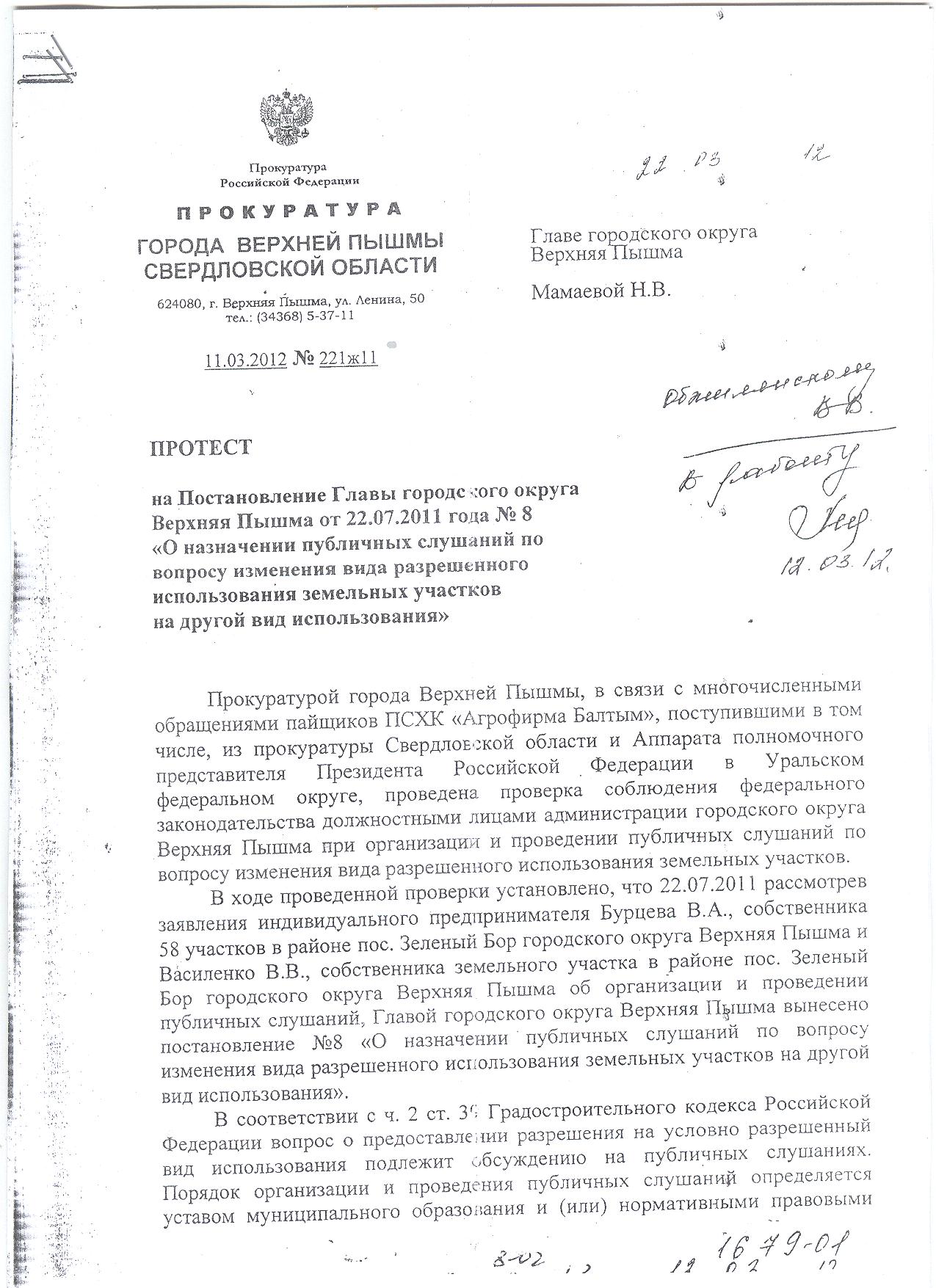 Так, 11 марта 2012 года надзорное ведомство вынесло протест Надежде Мамаевой. После проверки жалоб граждан в аппарате прокурора Свердловской области Сергея Охлопкова выяснилось, что верхнепышминские власти странным образом «входят в положение» Бурцева. Если в правилах о публичных слушаниях говорится, что их может инициировать группа граждан не менее 50 человек, то с «земельным деятелем» все проще: его заявку принимают даже индивидуально.
