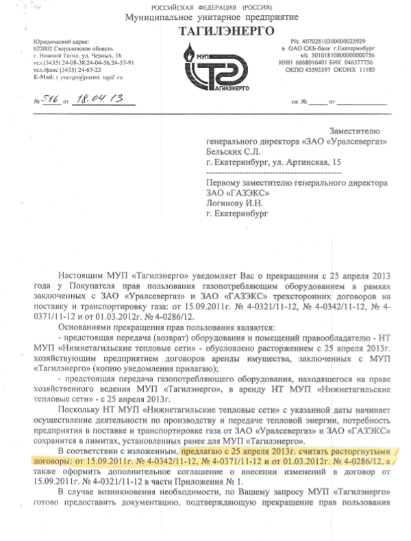 Уралсевергаз прекратил поставки голубого топлива 17 мая 2013 года: сезонный договор на поставку закончился, новый – не подписан из-за нерешенного вопроса по погашению долгов за ранее потребленный газ. Остановились 8 котельных из 25, при этом социально значимые объекты не пострадали. Прокуратура Ленинского района города направила исковое заявление в Ленинский районный суд с требованием признать действия газовиков незаконными, обязать возобновить подачу газа на котельные МУП «Тагилэнерго», а тот – принять газ.