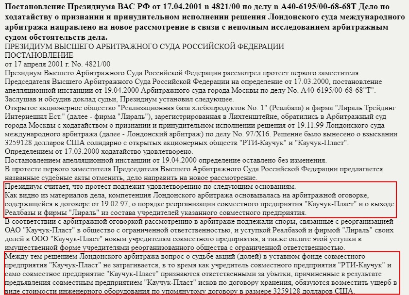 Вот только кому предстоит сдаваться, это ещё стоит выяснить. В итоге «РТИ-Каучук» в 2002 году продала имущественный комплекс завода дружественной компании «Металлоинвест», на что Секлер тоже отреагировал, посчитал проведение аукциона незаконным, об этом писал «Коммерсант» А что до «Каучук-Пласт» с иностранной «Лираль» в учредителях? Актив лопнул в 2014 году.