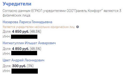 Даже поверхностный взгляд на многие конторы, имеющие отношение к «Гранели», вызывает подозрения в их нечистоплотности. Например, ООО «Гранель Комфорт», записанная на Ильшата Нигматуллина и Ларису Назарову, лишь единожды с 2013 года работало с небольшой прибылью порядка 200 тыс. рублей.