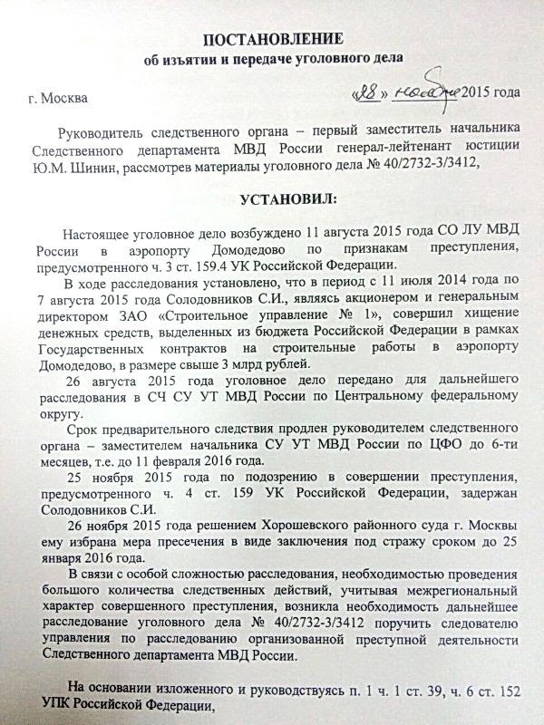 Однако строительные работы в аэропорту «Домодедово» стали объектом пристального внимания силовиков ещё в конце 2015 года. В ноябре 2015 года в Москве по подозрению в мошенничестве сотрудниками транспортной полиции по ЦФО был арестован директор Группы компаний «МДС-ГРУПП» Сергей Солодовников. В отношении него было возбуждено уголовное дело по ч. 4 ст.159 Уголовного кодекса РФ (мошенничество, совершенное организованной группой либо в особо крупном размере).