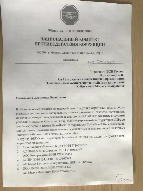 «В Национальный комитет… обратилась группа общественных активистов с материалами, а также данными из открытых источников, из которых следует, что рекламное агентство BBDO GROUP, входящее в крупный рекламный холдинг Omnicom Group, зарегистрированный на территории США со штаб-квартирой в городе Нью-Йорк, на территории Российской Федерации занимается сомнительными финансовыми махинациями и минимизацией налоговых платежей в бюджета РФ в огромных масштабах.