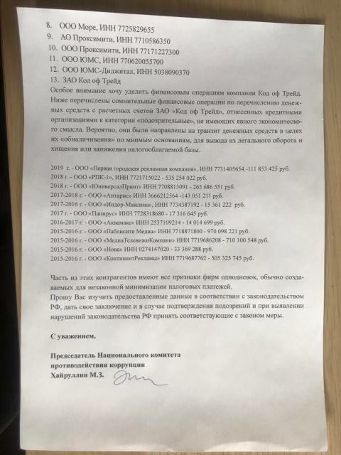 Прошу Вас изучить предоставленные данные в соответствии с законодательством РФ, дать своё заключение и в случае подтверждения подозрений и при выявлении законодательства РФ принять соответствующие с законом меры», - говорится в обращении к директору ФСБ Александру Бортникову, подписанном «Председателем Национального комитета противодействия коррупции Хайруллиным М.З.»