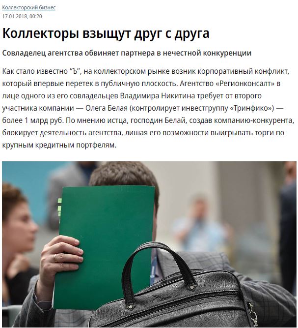 В данном конкретном случае говорится о коллекторском агентстве «Регионконсалт», у которого два совладельца. И вот один из них, а именно Владимир Никитин, подал иск в столичный арбитражный суд на контрагента – того самого Белая. Причина раздора между партнёрами – «схематозы» в работе последнего.