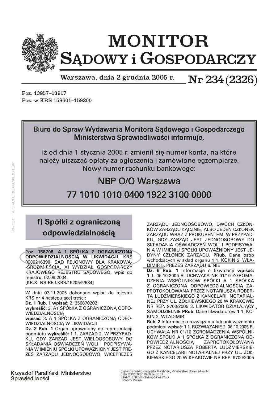Однако, самое интересное, что по данным польских регистрационных органов компания A1 Sp. z o o. (стр. 53-54 «Monitor Sądowy i Gospodarczy» № 234/2005) находилась в ликвидации с августа 2005 года и с этого момента её название было изменено на «A 1 Spółka Z Ograniczoną Odpowiedzialnością W Likwidacji» или более коротко «A 1 SP. Z O.O. W LIKWIDACJI». Ликвидатором компании, по данным польского реестра числился некий псевдо-поляк Владимир Кокин (Kokin Wladimir), он же должен был подписывать все документы от имени этой «экзотической польской компании». Так, что указанный в письме на имя Леонида Белых Ержи Кпрждецки, судя по всему, персонаж вымышленный. По крайней мере, в регистрационных документах польской компании нам обнаружить его не удалось. Да и компания эта очень странная, она была организована 02.08.2004 года, а уже через год была запущена её ликвидация. Не удивительно, что следственные органы Бурятии заинтересовались этой сделкой, ведь, как известно, в процессе ликвидации компании не ведут активной хозяйственной деятельности, тем более не заключают новых контрактов, которые, априори, не могут быть выполнены (сотрудники-то уже распущены, в штате один ликвидатор).
