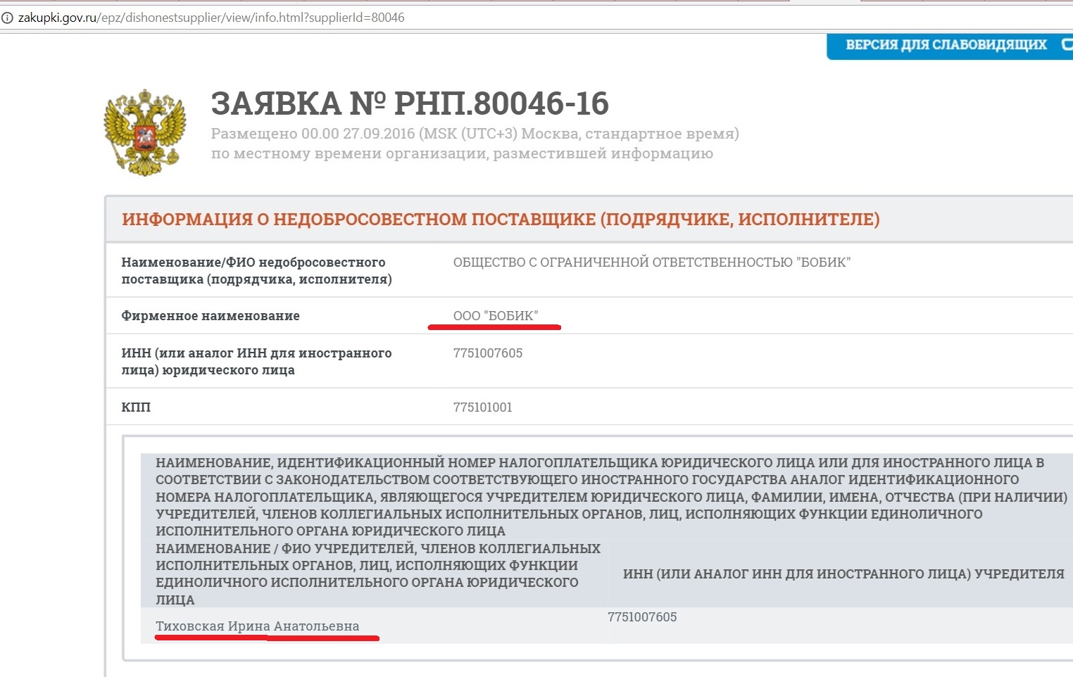 ООО «Бобик» и Тиховская как его учредитель до конца сентября 2018 года включены в Реестр недобросовестных поставщиков, который ведёт Федеральная антимонопольная служба. И проблемы у «Бобика» растут как снежный ком. На момент опубликования этой статьи в Единой информсистеме в сфере закупок тревожным маркером о прекращении отношений с исполнителем отмечены четыре контракта «Бобика» на 8 млн. 49 тыс. рублей.