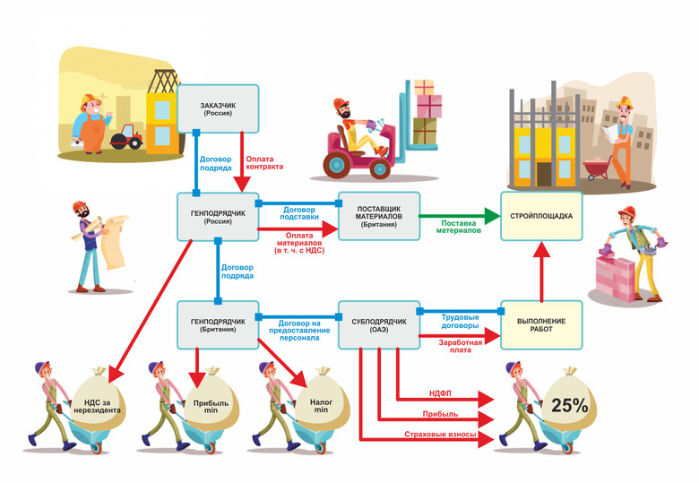 После этого киприоты поручают, например, арабам-субподрядчикам нанять рабочий персонал в РФ, а те, в свою очередь, предоставляют им рабочих в «аренду», при этом зарплату платят им сами со своих зарубежных счетов. Плюсы этой схемы в том, что арабы при выплате заработной платы вправе не выплачивать НДФЛ, а также не платят страховые взносы. После того, как стройка завершается, компании ликвидируются, а «выхлоп» в размере порядка 25% оседает на зарубежных счетах.