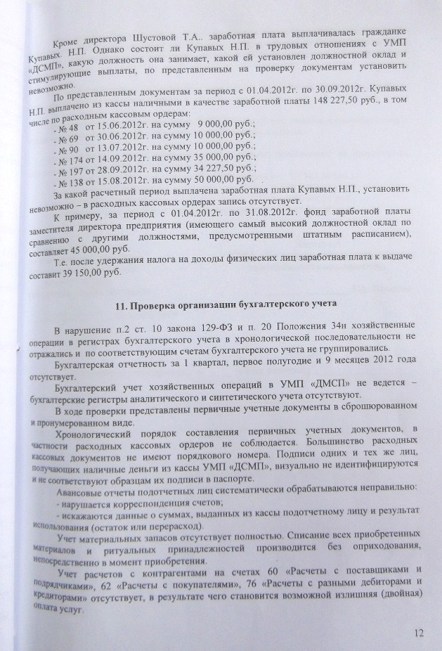 Факты грубейших нарушений при руководстве муниципальным унитарным похоронным предприятием еще в декабре прошлого года вскрыты финансовым управлением администрации городского округа Дегтярск. «Компромат-Урал» располагает многостраничным актом проверки от 21 декабря 2012 года и частично публикует этот документ. При законном раскладе выводы аудиторов стали бы черной меткой для директора ДСМП. Выручка предприятия в банк не сдается, кассовые операции не регистрируются, бухгалтерская отчетность отсутствует; подписи одних и тех же лиц, получающих деньги из кассы предприятия, визуально не идентифицируются и не соответствуют образцам их подписи в паспорте; искажаются данные о выдаваемых подотчетных суммах; полностью отсутствует учет материальных запасов; учет начисления и выдачи заработной платы не осуществляется – документы по начислению заработной платы отсутствуют; выявлена переплата зарплаты директору Шустовой. Это далеко не полный список разгромных выводов финансистов.