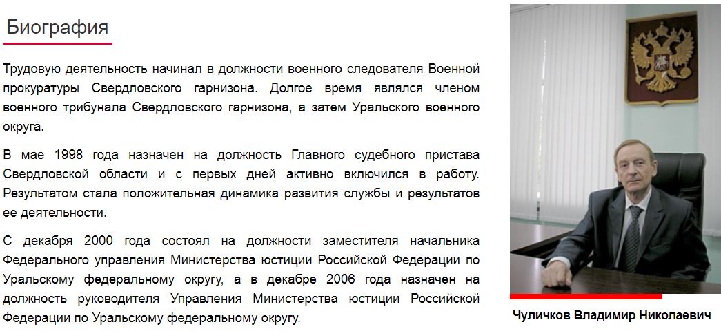 Так вот, даже поверхностный мониторинг деятельности той самой судьи Натальи Галимовой с сопоставлением её решения по Чуличкову, Бусылко и Вострецову не может не вызывать вопросов. 38-летняя госпожа Галимова два с половиной года назад назначена судьёй Седьмого кассационного суда общей юрисдикции, в котором председательствует Сергей Минин. С 2000 года в течение пяти лет Минин, согласно его публичной биографии, был начальником Главного управления юстиции Свердловской области, начальником Федерального управления Минюста РФ по УрФО. А теперь обратимся к биографии Владимира Чуличкова, отца одного из наших фигурантов: «С декабря 2000 года состоял на должности заместителя начальника Федерального управления Министерства юстиции Российской Федерации по УрФО, а в декабре 2006 года назначен на должность руководителя Управления Минюста РФ по УрФО».