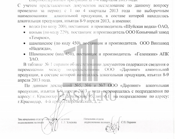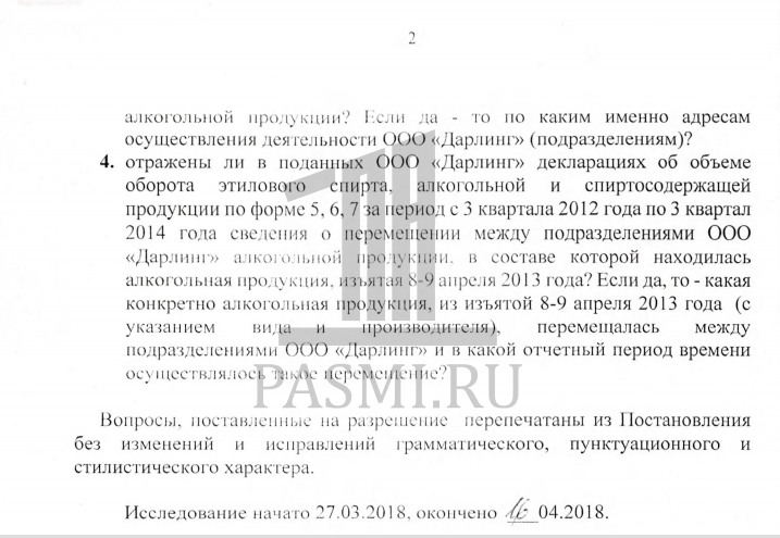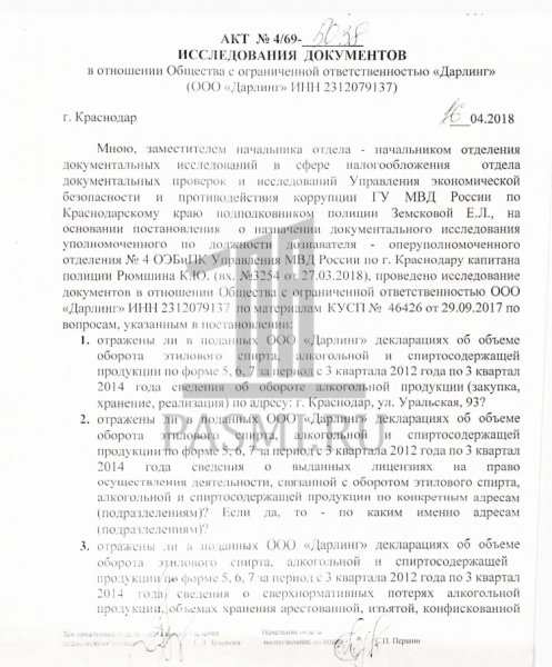 Ответы на эти вопросы нашел юрист Ясинского. По запросу Натальи Протасовой в 2018-ом году было проведено отдельное исследование экспертами главного управление МВД по Краснодарскому краю. Предмет проверки — декларации об объеме оборота этилового спирта, алкогольной и спиртосодержащей ООО «Дарлинг». Результаты пришли неожиданные.