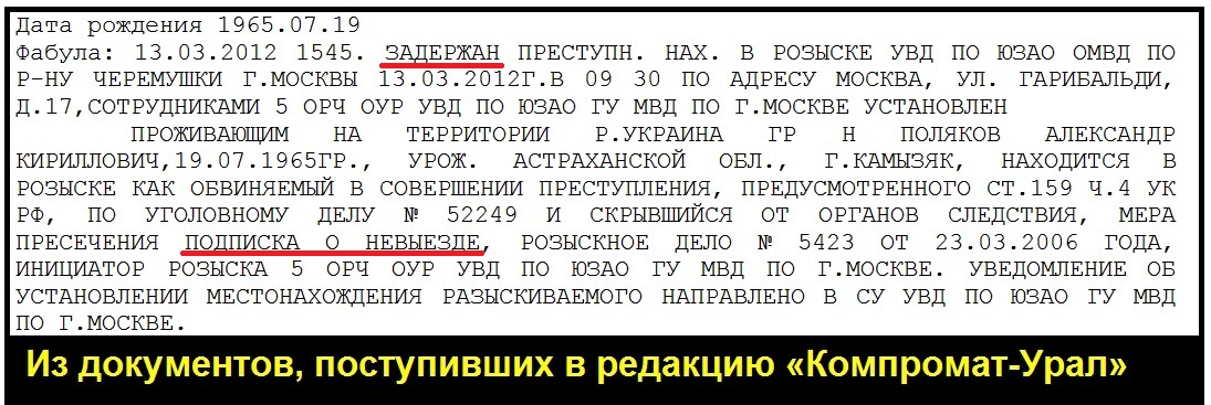 В 09:30 час. 13.03.2012 Поляков А.К. задерживался в г. Москва, ул. Гарибальди, 17 в качестве скрывающегося от следствия по УД № 52249 по ч. 4 ст. 159 УК РФ (мошенничество в особо крупных размерах), однако после установления места постоянного проживания на территории Украины был отпущен под «подписку о невыезде».