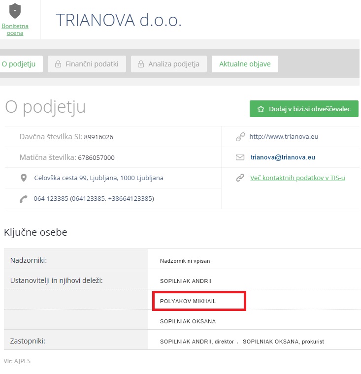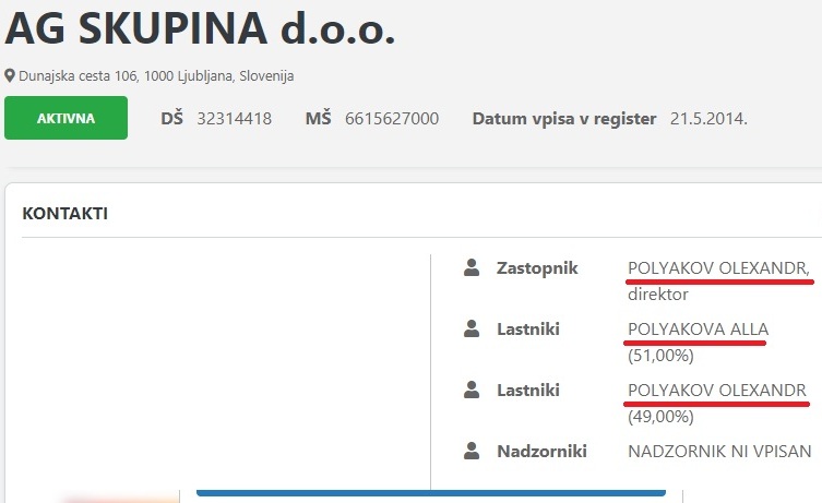Президентом Словении является Борут Пахор, премьер-министром – Янез Янша, главой полиции – Алес Хойс (Aleš Hojs). Они работают в столице – городе Любляна. И, вы не поверите, здесь же, в Любляне, зарегистрирован словенский бизнес беглого российского банкира, колесившего по Европе с липовым паспортом.