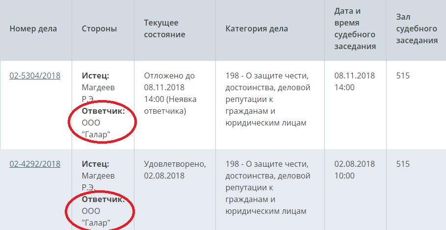 На портале районных судов Мосгорсуда отсутствуют тексты абсурдных определений судьи Иваховой об «обеспечительном» удалении публикаций, что тоже наверняка удобно истцу Рустэму Магдееву и другим интересантам скандального сюжета. В электронной картотеке во всех делах по искам «оскорблённого» казанского коммерсанта значится один и тот же ответчик – неизвестное ООО «Галар». На заседания в Черёмушки от юрлица, разумеется, никто не является. Многочисленные издания, участвовавшие в расследовании махинаций, о заседаниях в Черёмушкинском суде понятия не имеют, в дела по искам Магдеева не привлекаются, а узнают, когда поздно: уже по факту поступления «писем счастья» из Роскомнадзора.