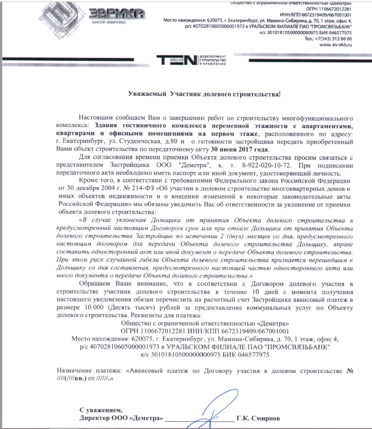 Проще говоря, группа «ТЭН» через подконтрольное ООО «Деметра» могла извещать граждан о готовности передать купленные квадратные метры только при условии, что от властей есть разрешение ввести здание в эксплуатацию, поясняет собеседник в департаменте Госжилстройнадзора Свердловской области. Но такого документа ни от подчиненных главы администрации Екатеринбурга Александра Якоба, ни от руководителя областного Минстроя Михаила Волкова быть не могло, иначе это - вопиющее должностное нарушение в интересах ГК «ТЭН» и повод для проверки на предмет коррупции.