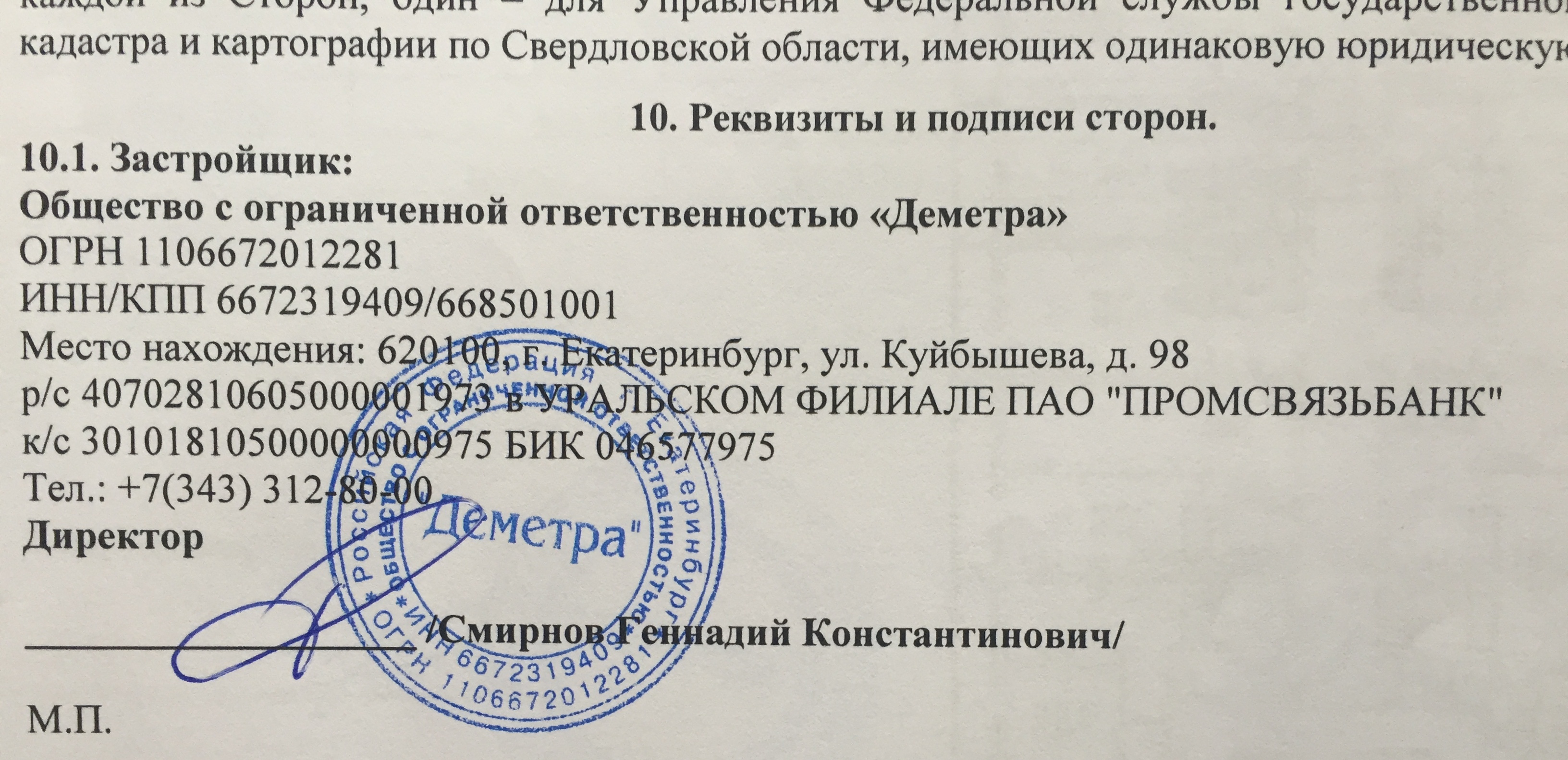 ООО «Деметра» (ИНН 6672319409), зарегистрировано в 2010 году. Уставный капитал – 10 тыс. рублей. Директор ООО «Деметра» - Геннадий Смирнов (ИНН 666201098320), единственный учредитель – Марина Трофимова (ИНН 667116985682), но ее доля заложена в ПАО «Промсвязьбанк» до марта 2018 года. В «Промсвязьбанке» находится и расчетный счет «Деметры» по договорам с дольщиками.