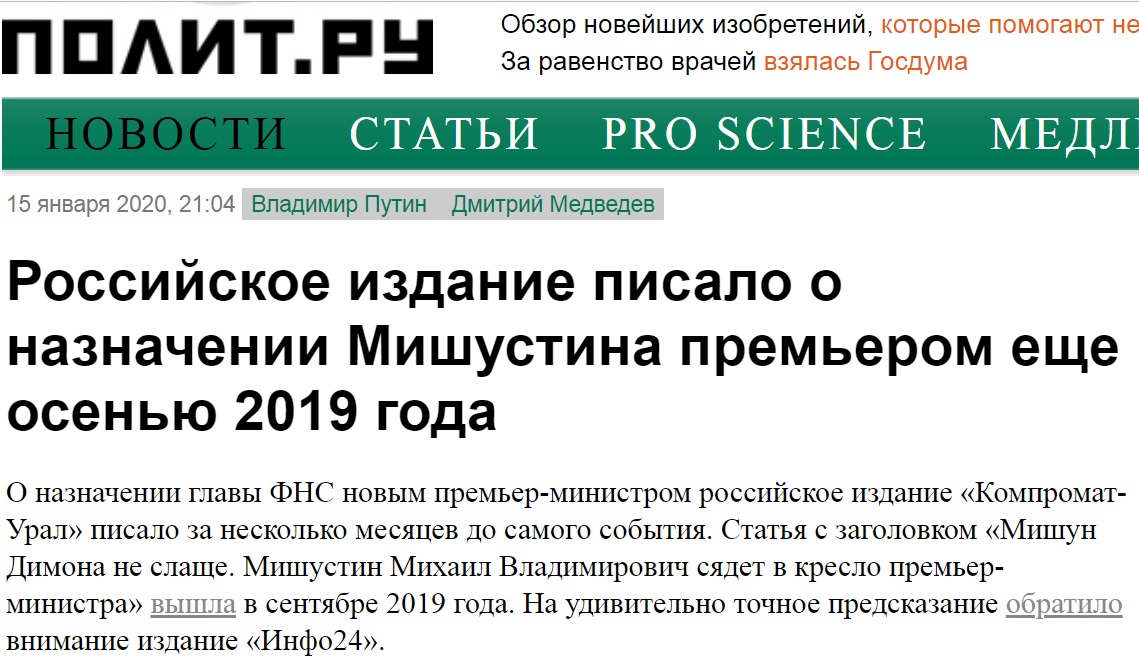 Так, «Полит.Ру» (одно из первых медиа в Рунете) отмечает, что «российское издание писало о назначении Мишустина премьером ещё осенью 2019 года». Цитируем подробнее: «О назначении главы ФНС новым премьер-министром российское издание «Компромат-Урал» писало за несколько месяцев до самого события. Статья с заголовком «Мишун Димона не слаще. Мишустин Михаил Владимирович сядет в кресло премьер-министра» вышла в сентябре 2019 года. На удивительно точное предсказание редакции «Компромат-Урал» обратило внимание и издание СМИ «Инфо24».