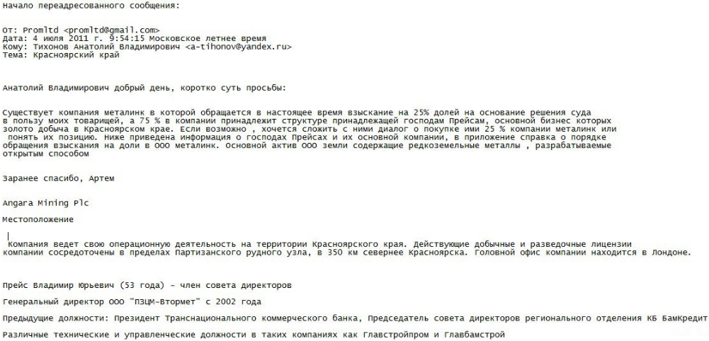 По одной из таких схем оказывал протекцию некой компании «Металинк», принадлежащей господам Прейсам, основной бизнес которых - золотодобыча в Красноярском крае. Причастность к «красноярским» обеспечила «Металинку» покровительство Тихонова в бизнесе. Хотя редкоземельные металлы не его специфика, а суммы «вознаграждения», как сообщается, были по его меркам копеечные, Тихонов, тем не менее, не отказался выступить посредником в ряде переговоров компании.