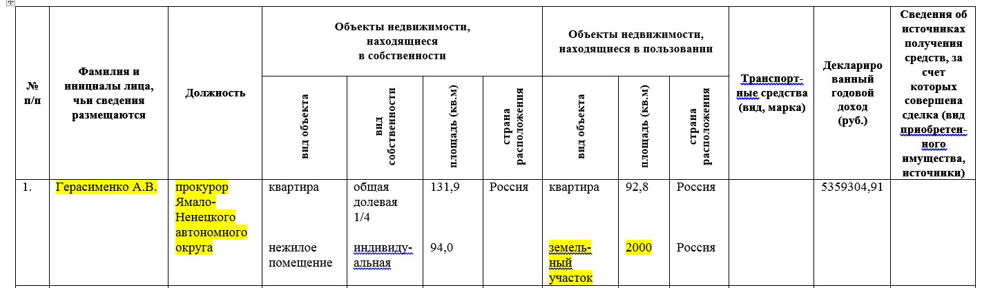 Кстати, согласно сведениям о доходах, расходах и имуществе сотрудников прокуратуры ЯНАО, размещенных на официальном сайте, прокурор округа Герасименко Александр Владимирович владеет земельным участком площадью как раз 2000 кв.м.