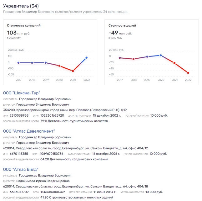 Возвращаясь в наши дни, Городенкер остаётся собственником долей в пяти действующих юрлицах. Всего он учредил более 30 компаний. Большинство - ликвидированы с большими минусами в финансах. Общая стоимость его компаний - чуть больше 100 млн. рублей, стоимость долей - минус почти 50 млн. рублей. Т.е. он может быть в долгах как в шелках. И для девелоперской структуры это, мягко скажем, скромные финансовые показатели.
