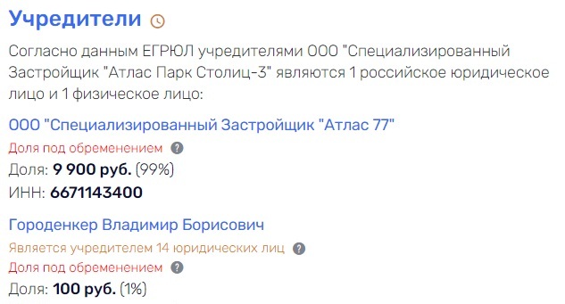 Откуда же деньги? Головная компания Городенкера "Атлас Девелопмент" не видела прибыли минимум с 2013 года, стоимость активов отрицательная. В другой фирме, ООО "Специализированный Застройщик "Атлас Парк Столиц-3, доли Городенкера и основного собственника - ООО "Специализированный Застройщик "Атлас 77", находятся под обременением у банка "Дом.РФ". Т.е. Городенкер пользуется помощью государства.