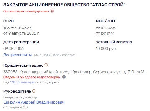 Что касается ЗАО "Атлас Строй", её на офшор Городенкер не записывал. Сам был собственником до 2018 года. Ныне ЗАО ликвидировано - опять же, за недостоверные сведения в ЕГРЮЛ. А юридический адрес - город Краснодар, Сормовская ул., д. 210, кв.18. Квартира в многоквартирном доме. Как-то несолидно для крупного девелопера...