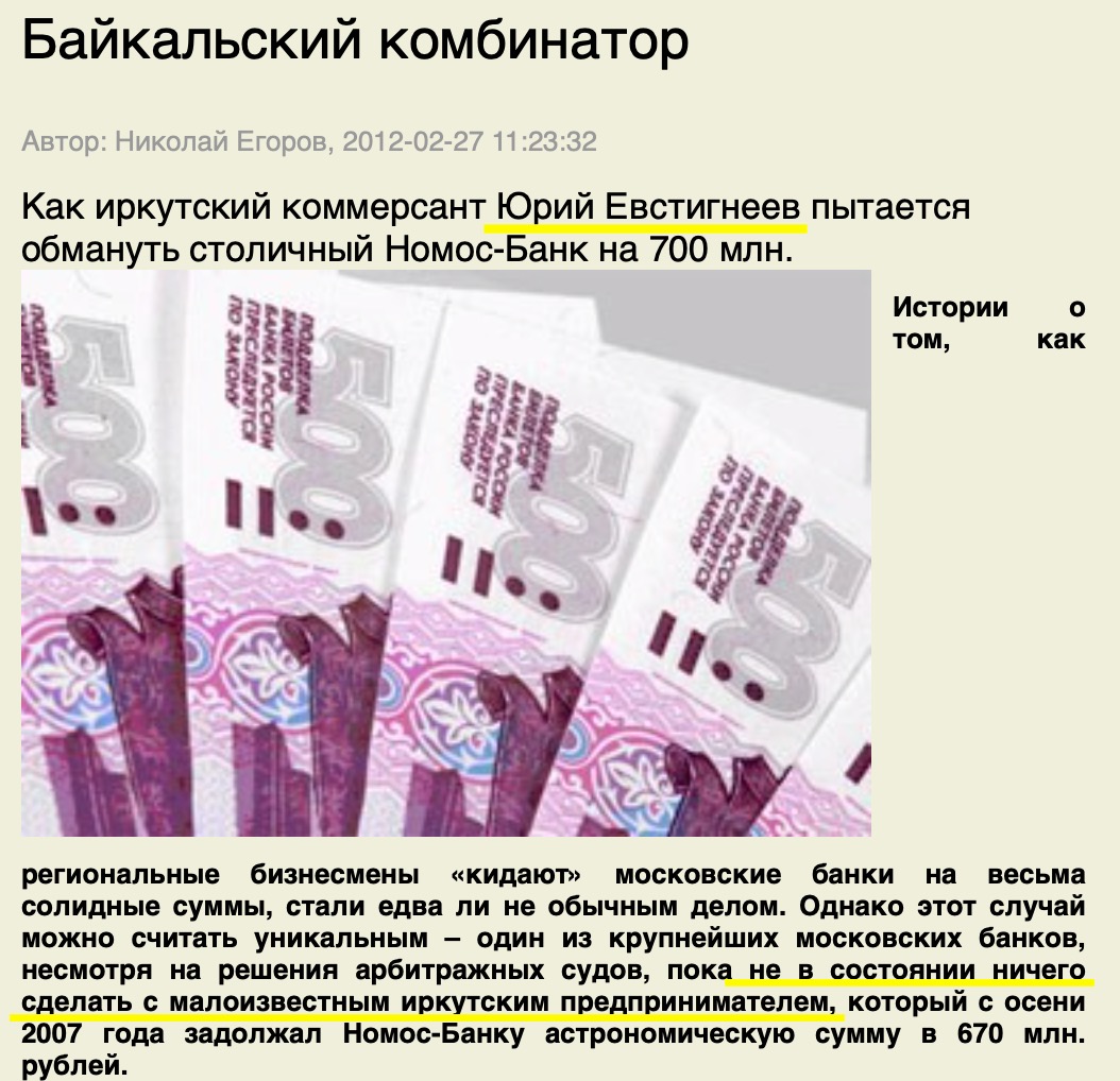 Солидный первоначальный капитал Евстигнеев сколотил, занимаясь в сибирском регионе торговлей «Жигулями» по реэкспортной схеме Бориса Березовского. Так же по данным издания The Moscow Post, Евстигнеев имел связи и влияние на «Сибакадембанк» и с лёгкостью получал там кредиты: сначала $5 млн. на покупку акций Иркутского Керамического завода, а затем $20 млн. на покупку отеля «Солнце» в Иркутске. От «Сибакадембанка» кредит уже в 780 млн. рублей перешёл на «Номос Банк». И когда пришло время его отдавать, Евстигнеев начал процедуру банкротства.