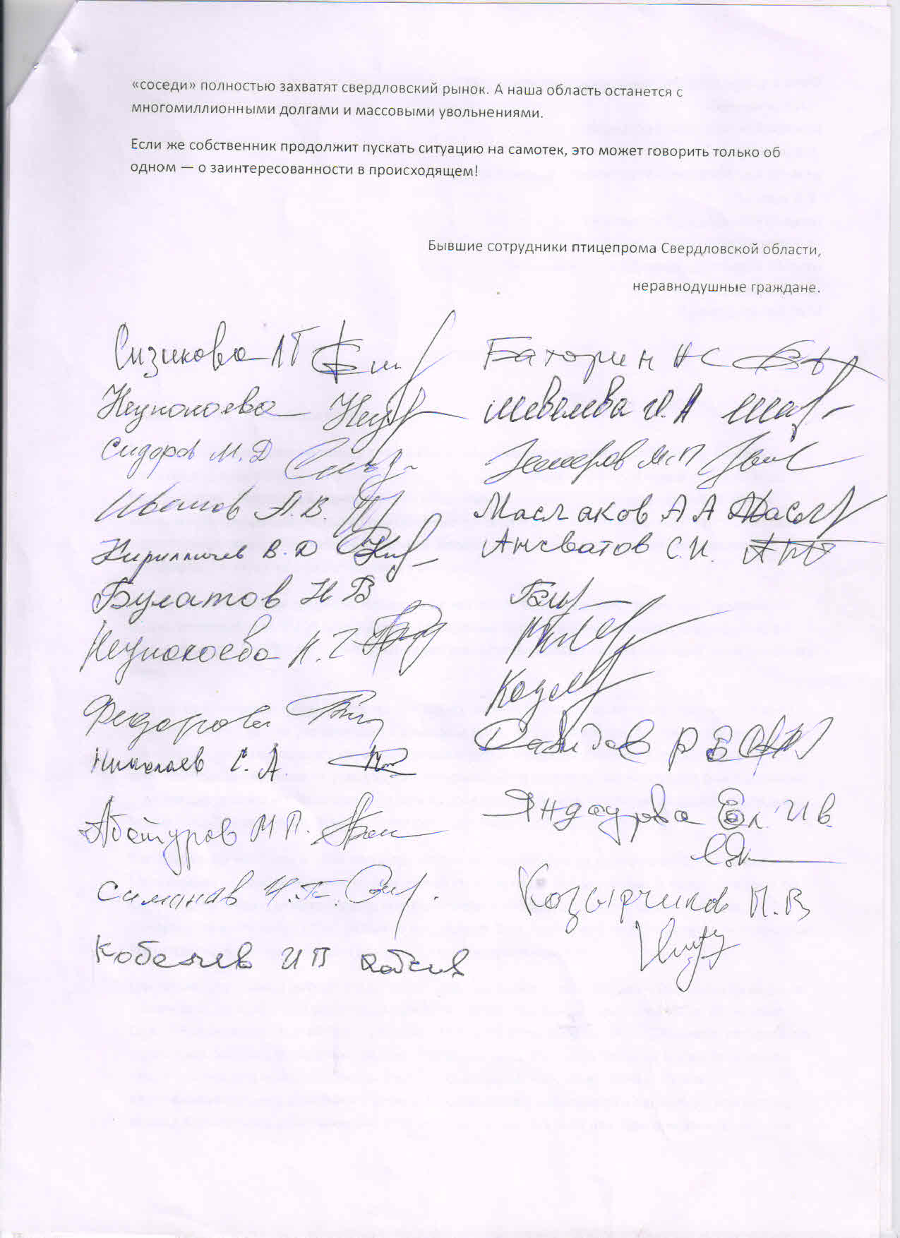 Мы, жители Свердловской области, отдавшие годы жизни нашему птицепрому, не можем равнодушно смотреть, как его уничтожают. Уничтожают планомерно, системно ― год от года. Безграмотный, бездарный менеджмент региональных птицефабрик в купе с ослабевающей экономикой превращает когда-то прибыльные предприятия в предбанкротные. Растущие убытки и долги подрывают и без того дефицитный бюджет области. А ведь когда-то свердловский птицепром считался «золотым активом» региона!