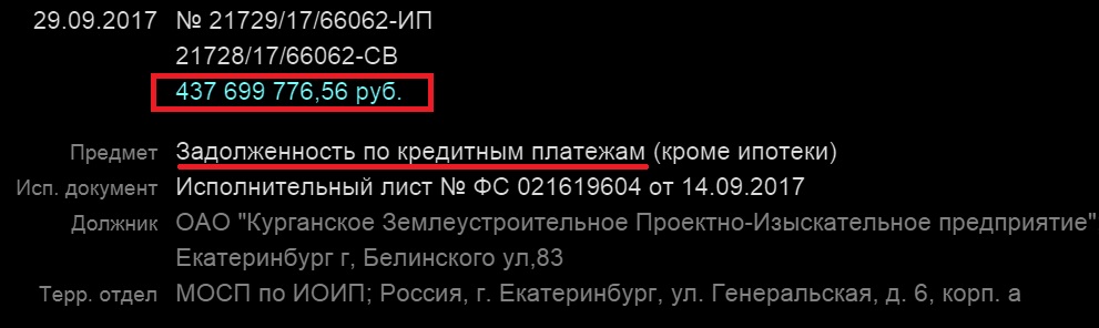 Причём вся эта сумма досталась единственному (!) контрагенту – ОАО «Курганское землеустроительное проектно-изыскательское предприятие» (ИНН 4501103935, «Кургангипрозем»). Именно в июле 2014 года фирма сменила адрес с Кургана на Екатеринбург, улица Белинского, 83, 19/03 (где некоторое время находилось ООО «Золотая горка-Строй»). Ещё в декабре 2016 инспекторы ФНС выявили недостоверность контактных данных юрлица в Екатеринбурге, с того момента ситуация не изменилась. В настоящее время счета предприятия заблокированы налоговиками, и за последние три года фискалы десятки раз включали их в «мёртвый список»! Согласно базе ФССП, на «Кургангипроземе» висит огромный долг, свыше 437 млн. рублей.