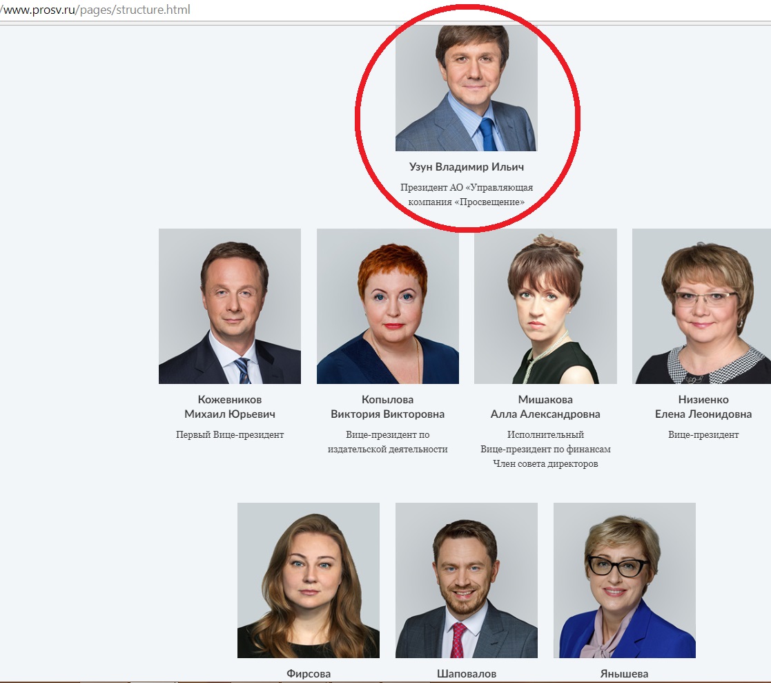 Да что госреестр – на сайте самого «Просвещения» наблюдается аналогичная картина. Узун – президент. А Кожевников как был, так и числится первым вице-президентом, наряду с простыми замами: Викторией Копыловой, Аллой Мишаковой, Еленой Низиенко, Алексеем Шаповаловым, Еленой Янышевой и Натальей Фирсовой (о них портал «Компромат-Урал» будет рассказывать отдельно, принимаем информацию по адресу: kompromat-ural@protonmail.com).