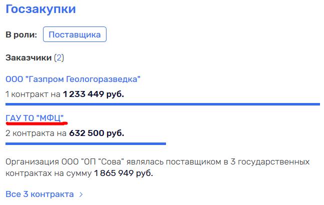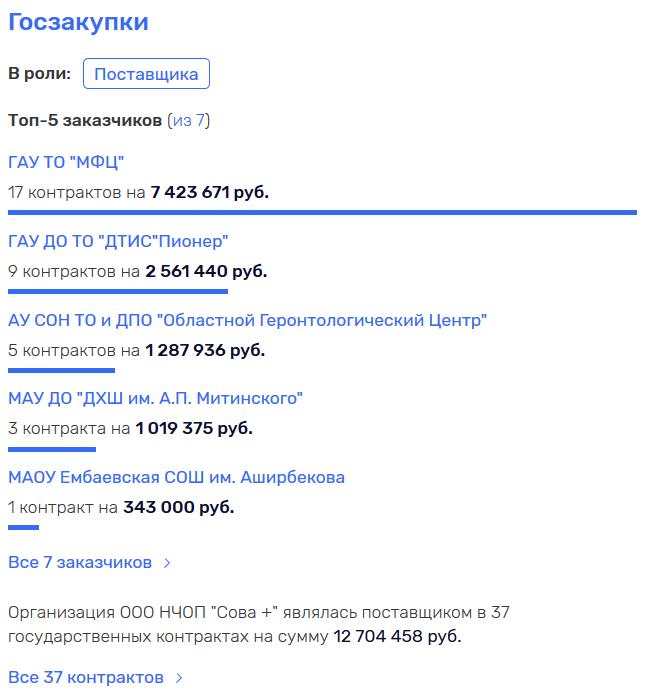 «Сова+» очень плотно сидит на заказах. Организация являлась поставщиком в 37 госконтрактах на сумму 12 млн рублей. Из них самые крупные МФЦ и дома творчества «Пионер» (подконтрольны департаменту физкультуры и дополнительного образования Тюменской области).