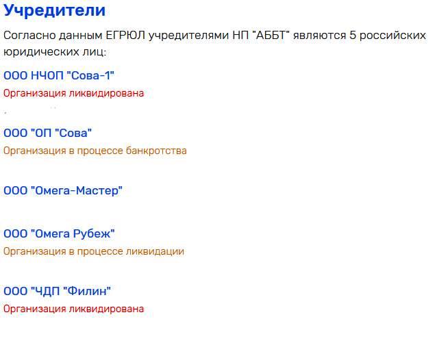 Было у него ликвидировано ООО «Агентство безопасности бизнеса – Юриус». Зато открылось НП «Агентство безопасности бизнеса – Тюмень», оно сейчас действует, зато в учредителях сплошь ликвидированные фирмы, кроме одной. Как такое может быть?
