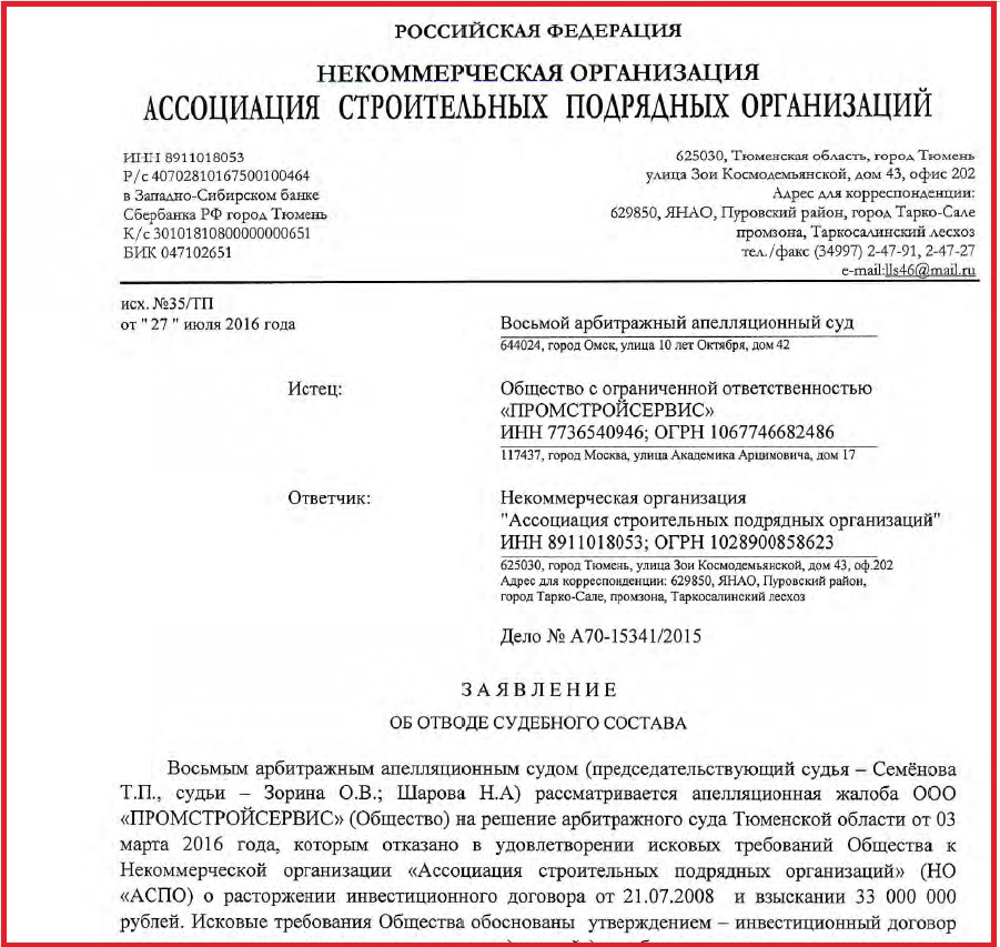 Жалобу ООО «Промстройсервис» в Омске, в восьмом апелляционном арбитраже рассматривает второй состав под председательством Татьяны Семеновой, с участием судей Ольги Зориной и Марины Смольниковой. В конце июля АСПО заявила отвод данному судебному составу, поскольку возникли основания сомневаться в беспристрастности при отправлении правосудия.