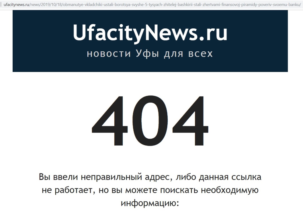 Однако спустя несколько дней проблемная для Радия Хабирова и Флюра Галлямова публикация исчезла с сайта информагентства. Более того, 23 октября «UfacityNews» разместило абсурдное по своей сути «опровержение»: «Опровержение ранее опубликованной информации в статье «Обманутые вкладчики устали бороться»: Свыше 5 тысяч жителей Башкирии стали жертвами финансовой пирамиды, поверив своему банку» в СМИ UfacityNews от 17 октября 2019 года относительно деятельности ООО «Золотой запас»: факты, описанные со слов вкладчиков, не соответствуют действительности».