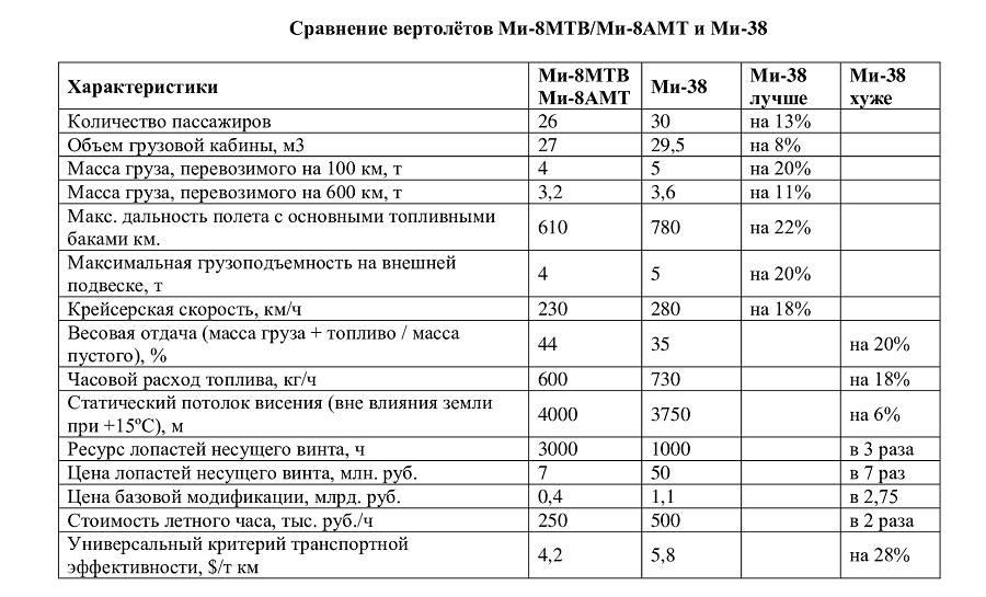 Из таблицы видно, что никакого рыночного эффекта при замене традиционных Ми-8МТВ/Ми-8АМТ на «новейший» Ми-38 не существует. Более того, по ряду показателей (ресурсы основных агрегатов, прямые эксплуатационные расходы, стоимость вертолёта и заменяемых агрегатов) Ми-38 уступает вертолётам Ми-8МТВ/Ми-8АМТ в разы.