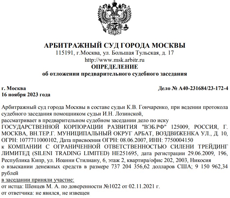 Все дела планируется рассмотреть уже в 2024 году. Так, на 27 февраля назначено заседание по иску к кипрской Equalchance Processing Limited. Известно лишь, что с неё пытаются взыскать 494 581 951,81 доллара США (около 44,6 млрд рублей).