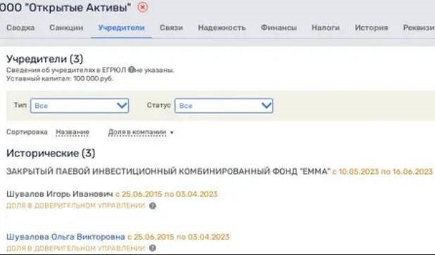 ООО "Открытые Активы", которое специализировалось на вложениях в ценные бумаги, было ликвидировано в декабре 2023 года, показав за 2022 год падение прибыли на 85%, до 41 млн рублей. Кстати, саму компанию оценивали в 4,2 млрд рублей. Деньги, похоже, вывели через ЗПИФ "Емма". Именно он числился владельцем двух активов после самого Шувалова и его супруги - Ольги Викторовны Шуваловой.