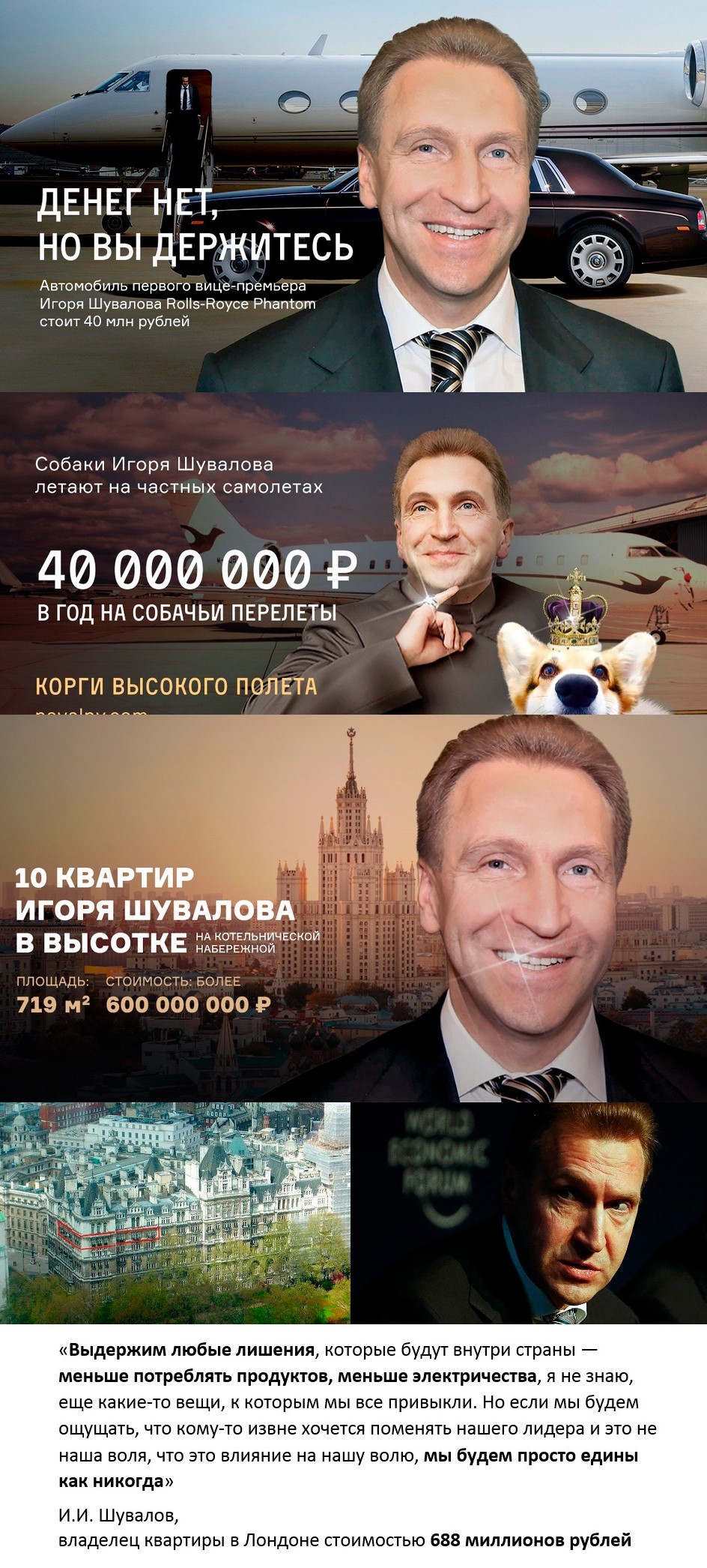Читатели напомнили редакции «Компромат-Урал», что когда несколько лет назад вокруг Шувалова и его жены разразился грандиозный коррупционный корги-скандал, тогдашний вице-премьер Шувалов («ненастоящий Игорь Иванович») подрядил известного околокремлёвского «либерала» Алексея Венедиктова на PR-кампанию по отбеливанию своей, шуваловской, репутации. Бывший глава службы безопасности президента РФ Александр Коржаков комментировал тот скандал так: «Сейчас все про Шувалова говорят. У меня за гаражом дом его бывшего коменданта. Он ушёл, не смог работать там. Когда всё это “Сколково” было, деньги Шувалову привозили в грузовиках. В коробках, в мешках, просто в пачках огромных таскали в дом. Загружали в шкафы для одежды», – заявил Коржаков.