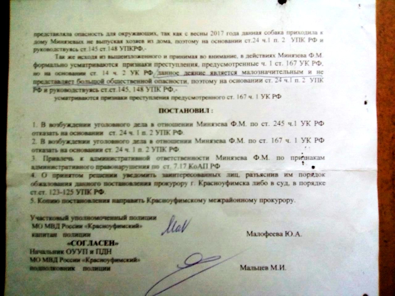 Капитан полиции Юлия Малофеева не увидела состава преступления в действиях Фарита Минязева (КУСП 6788 от 17 июня 2017 года) по ст. 245 УК РФ (жесткое обращение с животными). В отказном постановлении (копия имеется в редакции «Компромат-Урал») Юлия Александровна пишет, что «собака представляла опасность для окружающих». Однако многочисленные отзывы жителей говорят об обратном. Более того, имеются фото того, как «опасный» пес благополучно играет и ласкается с детьми.