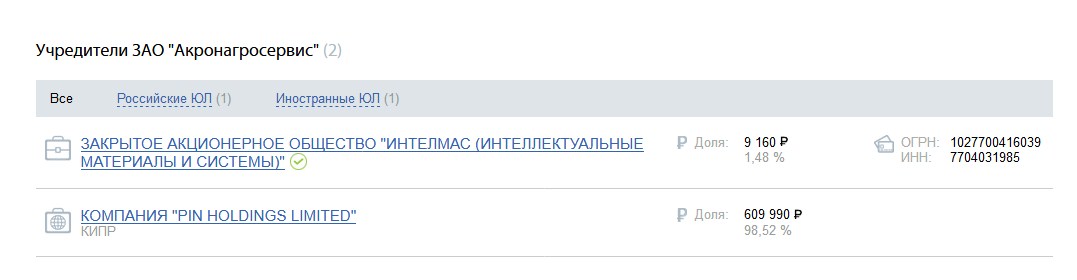 Почти четвертью «Дорогобужа», 23%, владеет компания ЗАО «Акронагросервис». И она тоже прочно связана с офшорами. Её первый собственник, ЗАО «Интелмас», на 100% принадлежит американскому офшору «Райтон Лимитед». Сейчас у этой компании могут быть серьёзные проблемы в связи с попаданием Кантора в санкционный список.