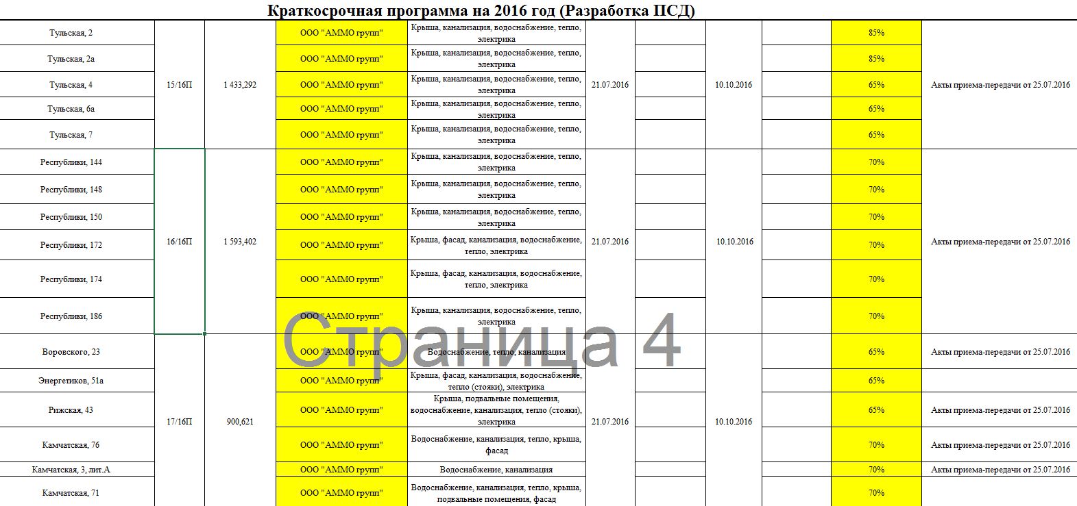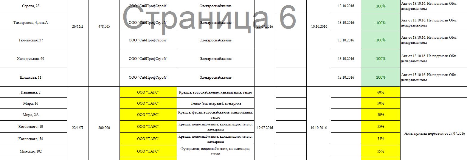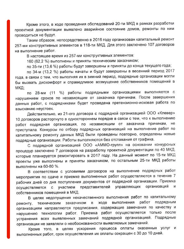 1. Выполнение строительно-монтажных работ: крыша плоская и скатная, электроснабжение, водоснабжение (магистраль и стояки ХГВС), тепло (магистраль, стояки), водоотведение (выпуск, магистраль, стояки). По данному разделу из 96-ти многоквартирных домов 100% работ выполнено всего на 10 объектах! На 18-ти домах исполнение работ составляет 0%, а по 14-ти домам вообще нет никаких данных. Это при том, что самая поздняя дата выполнения работ – 2 декабря 2016г. Лидером по количеству неисполненных работ является ООО «Клевер».