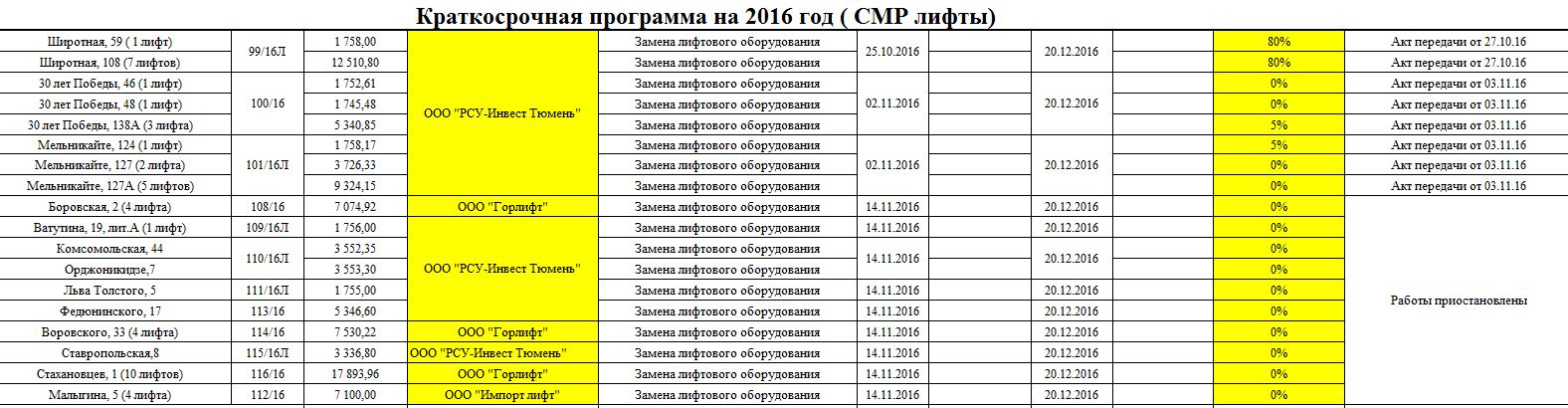 3. Строительно-монтажные работы по установке лифтов. Здесь сроки выполнения работ заканчиваются 20 декабря 2016г., но поскольку в настоящее время доступ к данным сайта закрыт, то исходим из данных, размещенных на 2 декабря. Из 18-ти объектов всего два находятся в стадии исполнения 80%, два по 5%, у остальных – 0%. По десяти объектам работы приостановлены.