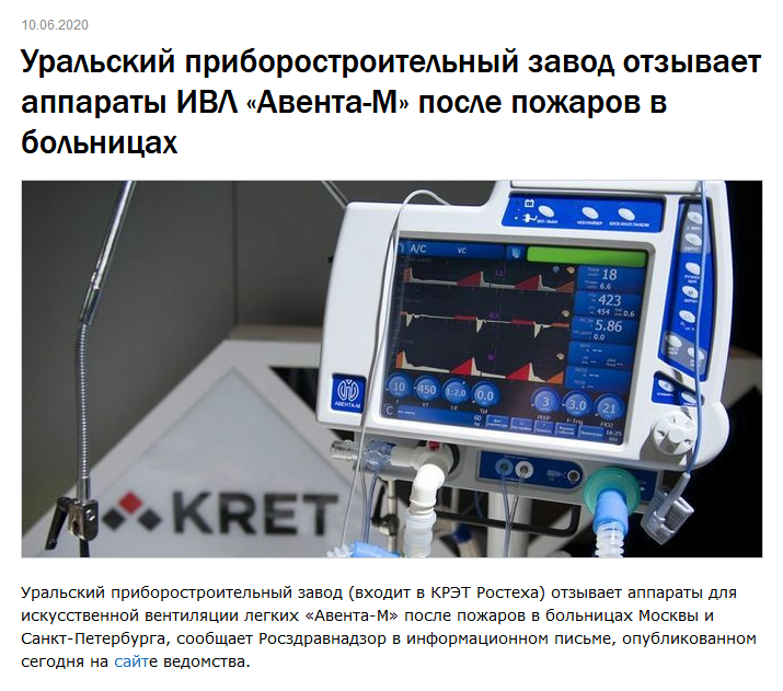 Один из самых свежих скандалов, к тому же приведший к ужасающим последствия, произошел в самом начале пандемии коронавируса. Тогда в Санкт-Петербурге в больнице Святого Георгия произошёл пожар из-за неисправных аппаратов ИВЛ «Авента-М», произведённых одним из заводов концерна КРЭТ. Сразу же заговорили о том, что комплектующие медицинской аппаратуры КРЭТ закупает в Китае, причём, не лучшего качества. В частности, об этом писала «Комсомольская правда» в публикации с неординарным названием «Да, детали из Китая, но зачем панику разводить».
