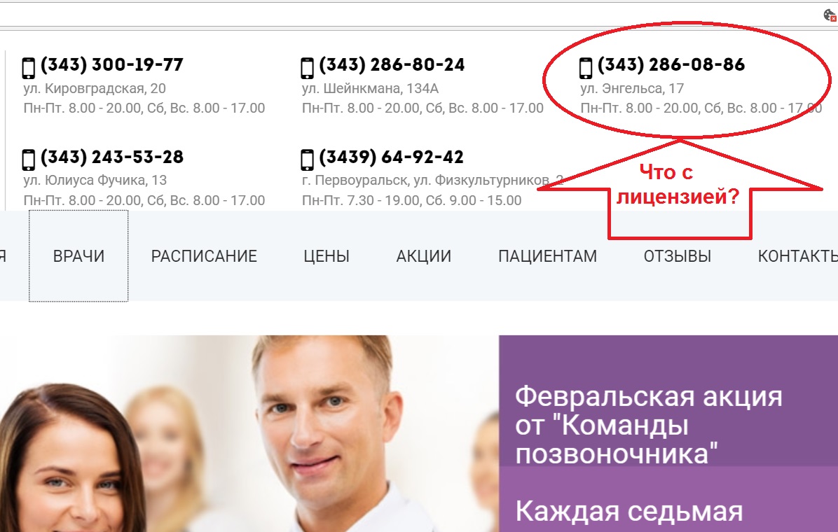 Повторим, во всех случаях лицензирующим органом является Министерство здравоохранения Свердловской области, соответствующий отдел в нём возглавляет Наталья Харламова. Упоминания о лицензии на заведение по Энгельса, 17 в Екатеринбурге в едином госреестре юрлиц по вышеназванным предприятиям не обнаружены, хотя приём пациентов и оказание медуслуг по этому адресу идёт полным ходом.