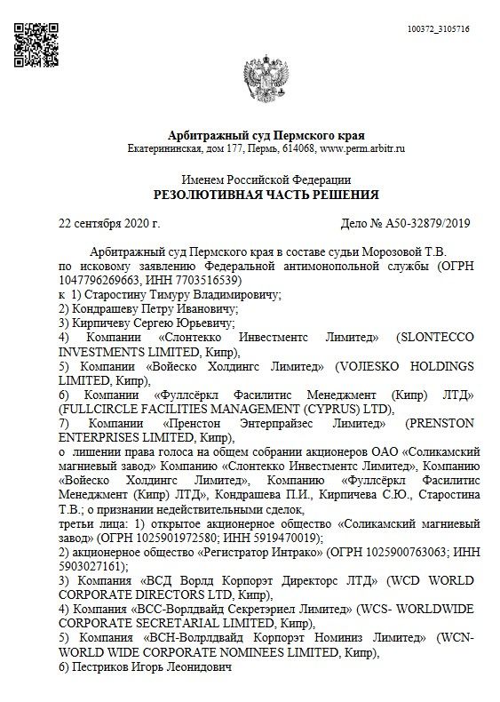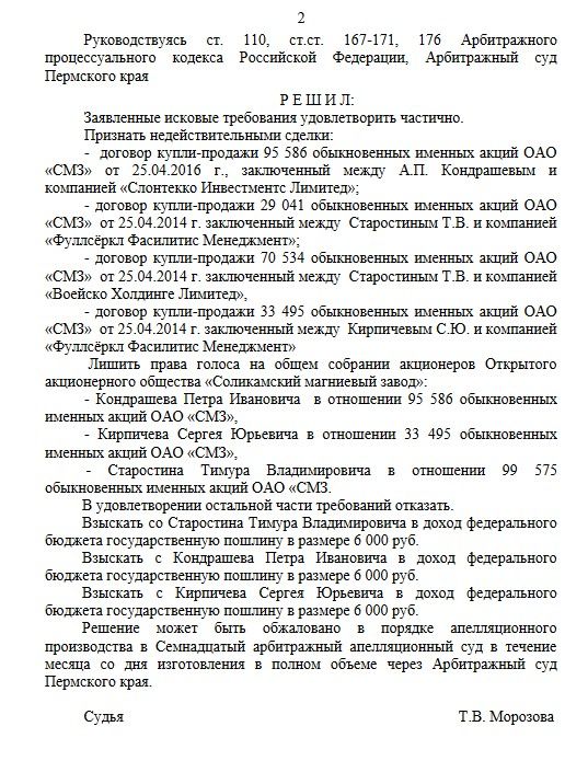 Теперь согласно решению Арбитражного суда Пермского края, эти сделки признаны недействительными договоры купли-продажи 95 586 акций СМЗ от бенефициара Петра Кондрашева компании «Слонтекко Инвестментс Лимитед», а также по приобретению 62 536 акций компании «Фуллсеркл Фасилитис Менеджмент» и 70 534 акций «Воейско Холдинге Лимитед».