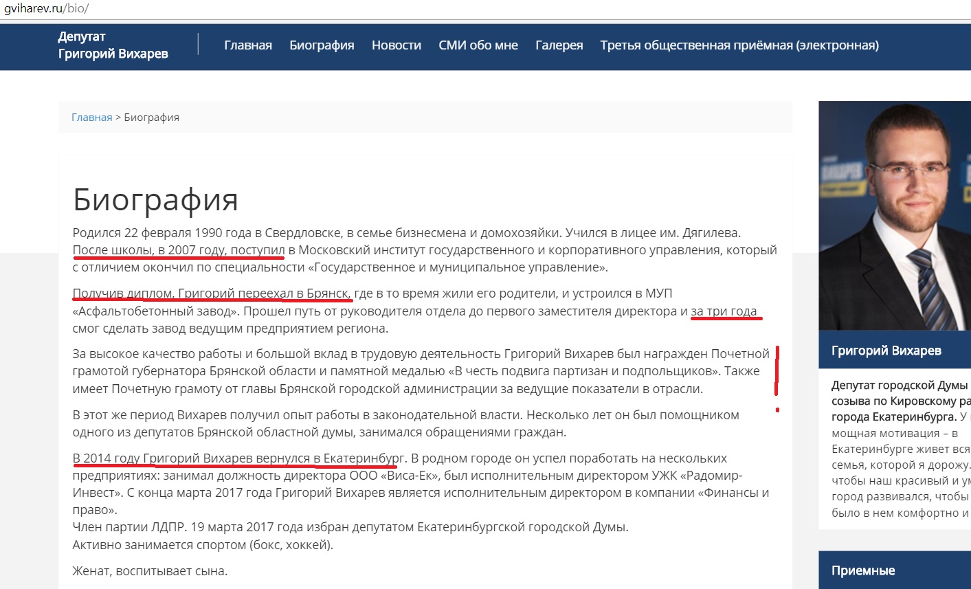 Подсчитаем по данным, которые сам Григорий Вихарев указывает в биографии. После школы в 2007 году поступил в вышеназванный супер-пупер-институт. Плюс пять лет, чтобы хотя бы формально дотянуть до диплома (даже если ненастоящего). Выходим примерно на 2013 год. И возвращаемся к биографии: «В 2014 (!!!) году Григорий Вихарев вернулся в Екатеринбург. В родном городе он успел поработать на нескольких предприятиях: занимал должность директора ООО «Виса-Ек», был исполнительным директором УЖК «Радомир-Инвест», - говорится в публичном жизнеописании новоявленного депутата ЕГД. Разумеется, в 2014 году, когда тучи на Брянщине сгустились (папа в бегах, его покровитель-губернатор уже под статьёй) младшенькому Вихареву там ловить было нечего, и он подался на родину в Екатеринбург. Но по логике самого Григория Андреича, его трёхлетние менеджерские успехи в Брянске должны уместиться во временной клочок где-то между 2013 (трудоустройство в МУП после получения диплома) и 2014 (обратно в Екатеринбург) годами! Как так-то? Три года никак не клеятся.