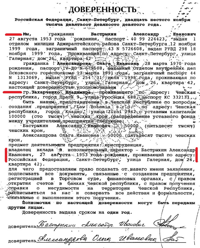 Новый директор – Владимир (Volodymyr) Захарченко. Хотя какой он новый? Он свой, проверенный, почти родной. Это тот самый Захарченко, которого Бастрыкин и его вторая (нынешняя) супруга Ольга Александрова ещё в далёком 1999 году уполномочили «быть нашим представителем в Чешской Республике по вопросу создания предприятия «Law Bohemia s.r.o.»…». Возвращаемся выше, к питерской доверенности. И без того узкий круг лиц замкнулся окончательно.
