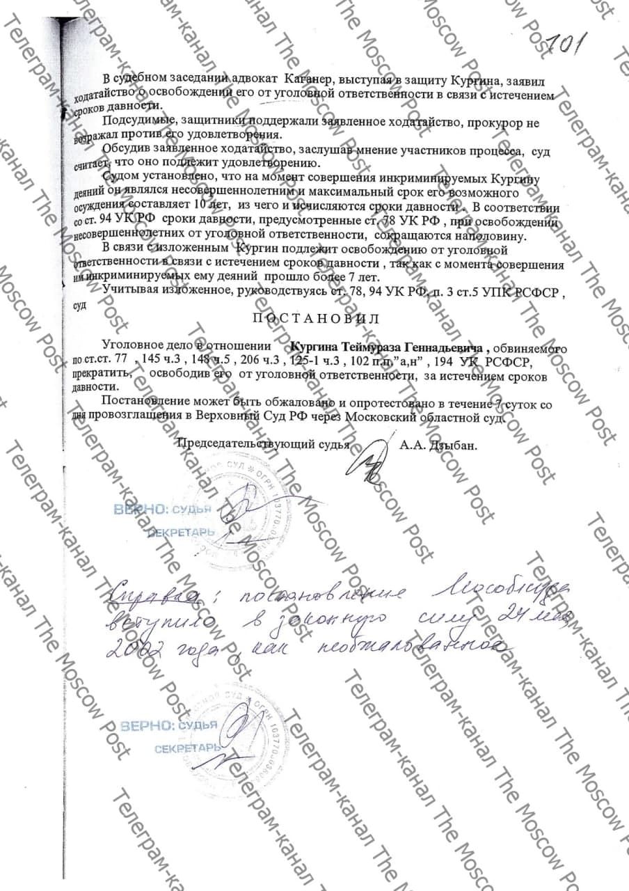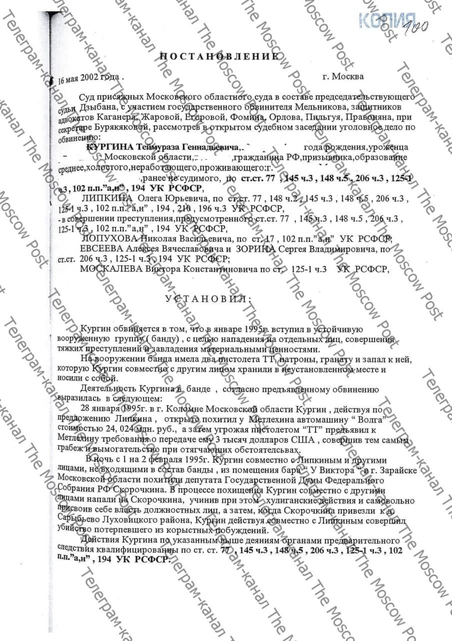 Но еще в феврале 2002 года Верховный суд в надзорном уголовном производстве рассмотрел это делу по существу, и, согласно картотеке этого производства, одним из обвиняемых по делу депутата Скорочкина мог проходить никто иной, как Теймураз (Тимофей) Кургин. Он обвинялся сразу по трем статьям.