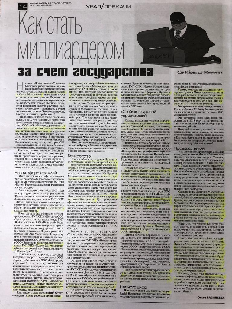 «То, с какой скоростью удалось решить довольно хлопотный вопрос с передачей земли ОООшкам (Лукача и Молотилова – прим. «Компромат-Урал»), удивляет. Каждый, кто хотя бы раз оформлял сделки с недвижимым имуществом, может себе представить, сколько иногда приходится побегать с бумажками. В данном же случае речь идёт о сделке с крупными земельными участками, стоимость которых исчисляется миллиардами… и вот вдруг такая расторопность. Тут остаётся только предположить, что нашим героям помогали. Помогали в том числе и чиновники, в ведении которых находится распоряжение государственной собственностью», - сообщает «Федеральная газета 24» со ссылкой на «Новую газету».
